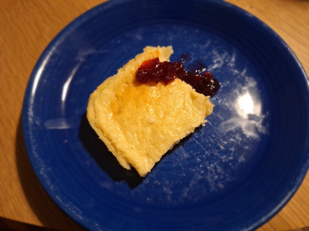 - 5 Serve: Let cool slightly, cut into squares and serve warm with jam and whipped cream.