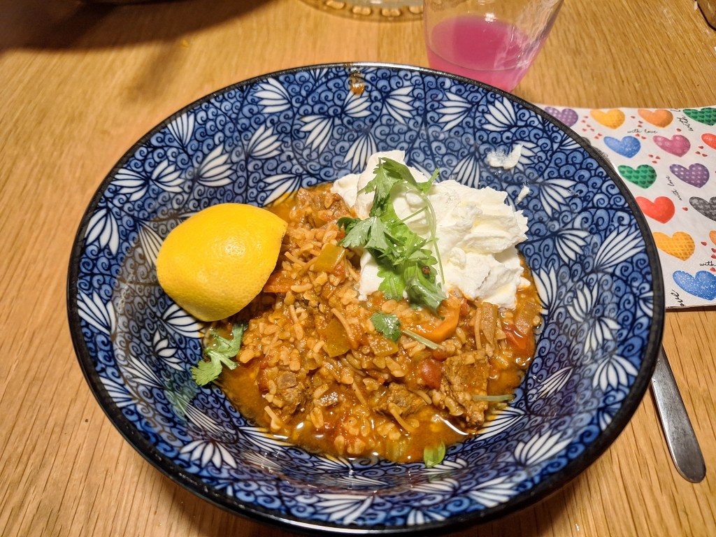 This was a bit more complicated to make, I needed about 40-45 minutes, but it was totally worth the effort! Very rich flavors, and can be done with either beef or lamb or chicken or even vegetarian should work as well (I guess chickpeas or okras should work). In my version here, I used beef and I added a little too much bulgur which absorbed quite a lot of the broth thus becoming less “soup” and more “wet dish”! Nonetheless, it was very tasty! About the Ras el Hanout, as far as I know, there are about a gazillion different recipes, the one I used, I am including here