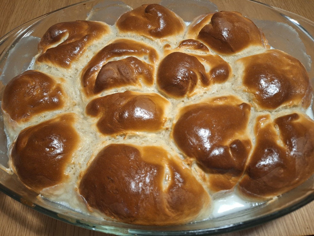 - Mix dough: Add remaining sugar, egg, salt and melted butter; mix in flour to a soft dough. Knead 5–7 min until smooth. Cover and rise 45–60 min until doubled.